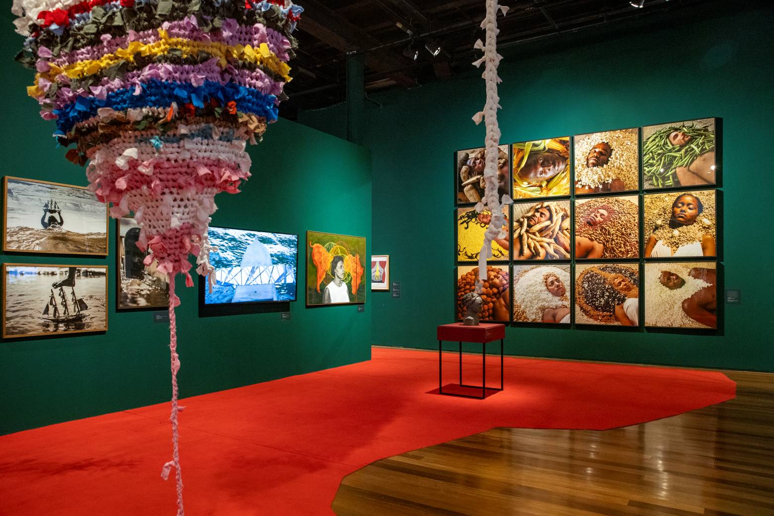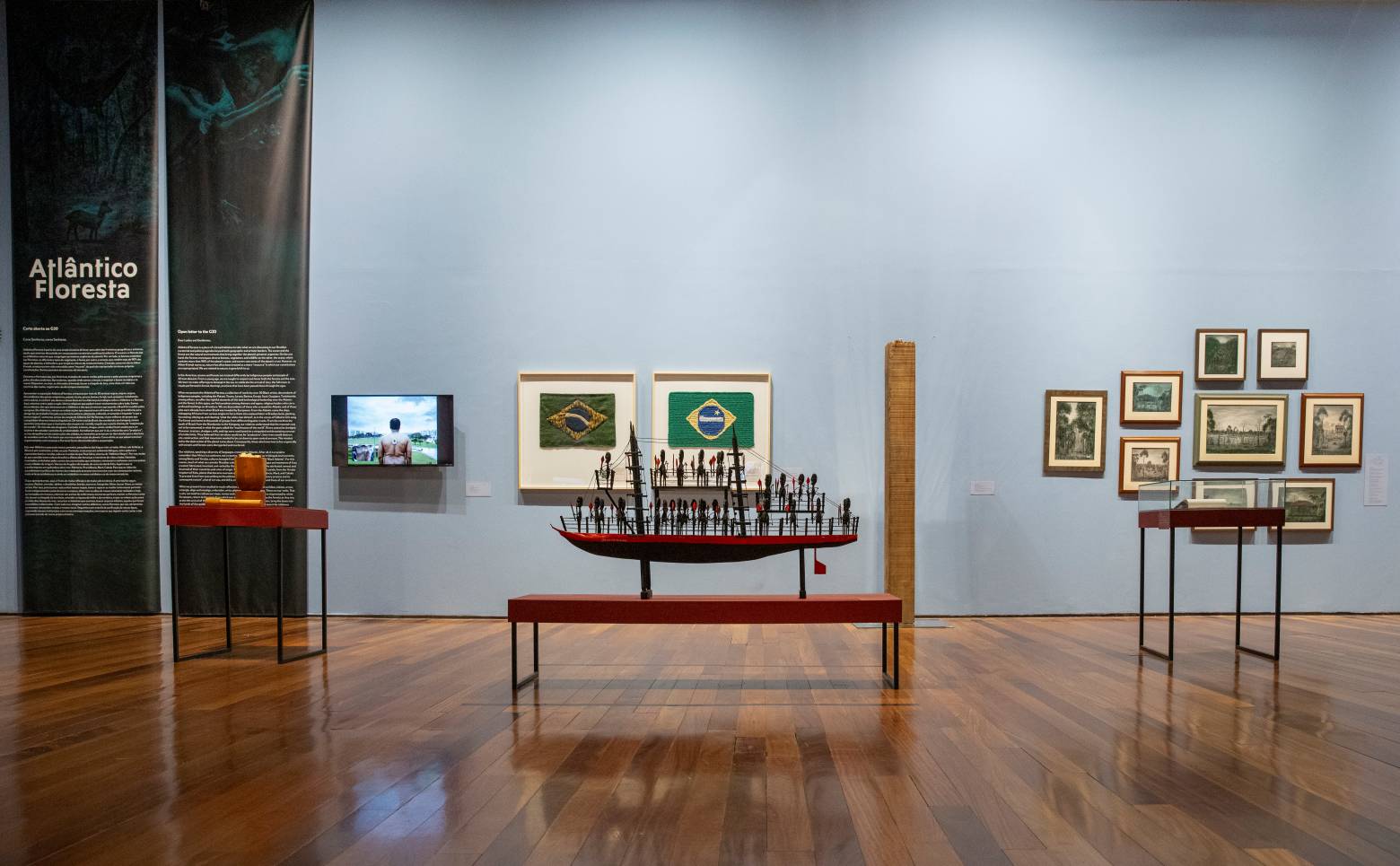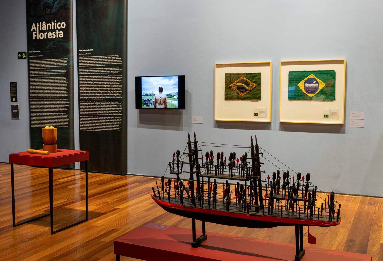 ATLÂNTICOFLORESTA é uma exposição especialmente pensada pela curadoria do Museu de Arte do Rio para o G20. Reunimos trabalhos da coleção do MAR, inclusive recém doados, e mantemos uma campanha de ampliação do acervo em relação a artistas indígenas. Com isso, focamos em dois pilares do pensamento contracolonial na geografia que constitui nosso país. Por um lado o Oceano Atlântico de onde vieram os grupos de pessoas sequestradas de diversos países do Continente africano. Por outro, a floresta que segue em disputa pelas demarcações de terras dos povos originários e contra a exploração do agronegócio. A exposição reúne cerca de 40 artistas entre os principais nomes da arte contemporânea do país, como, Aline Motta, Ayrson Heráclito, Denilson Baniwa, Ziel Karapotó.